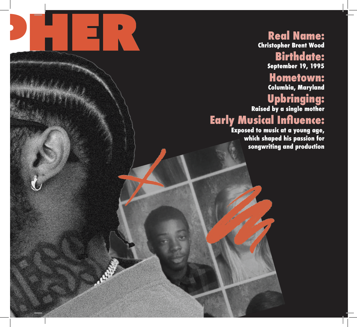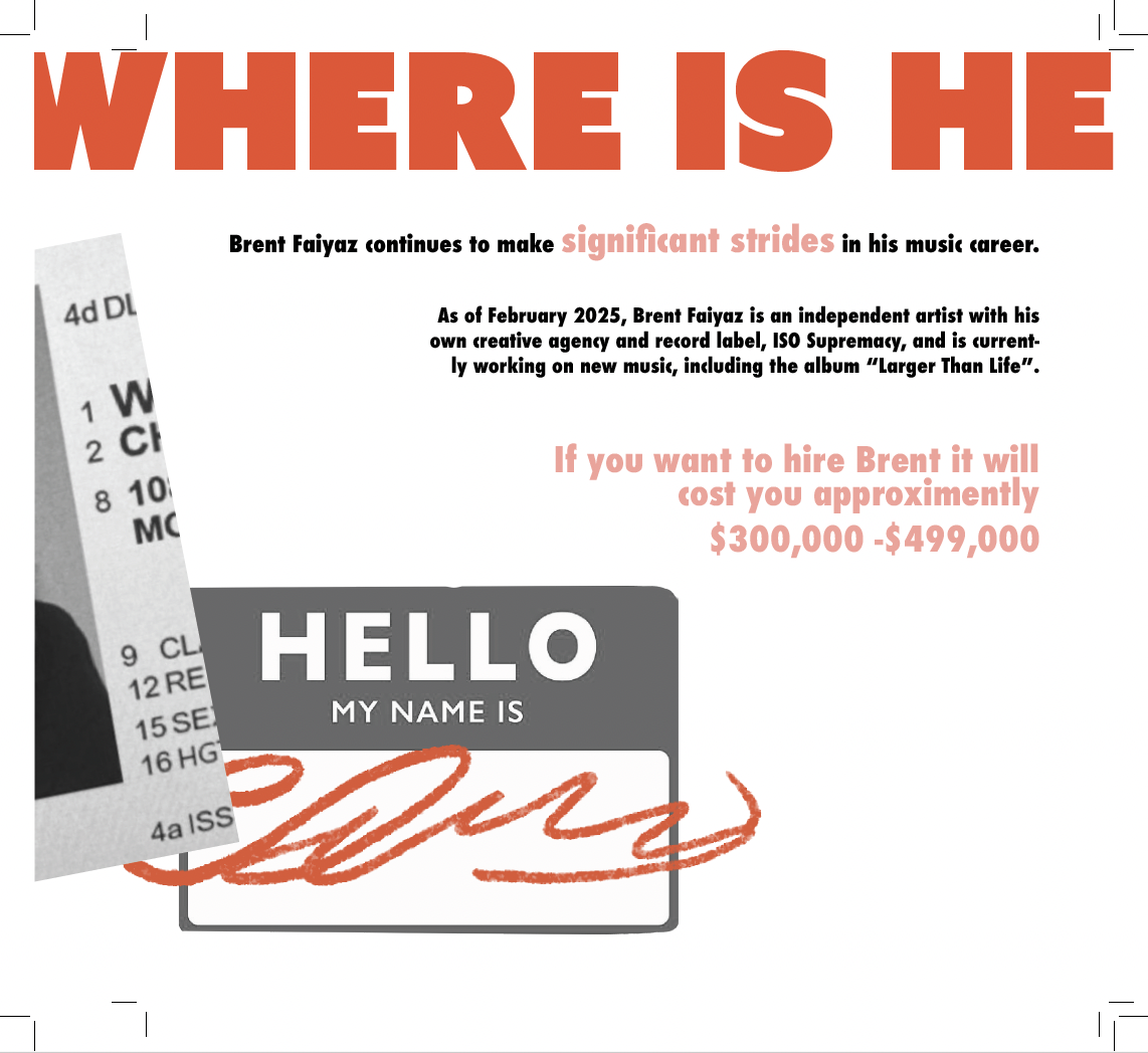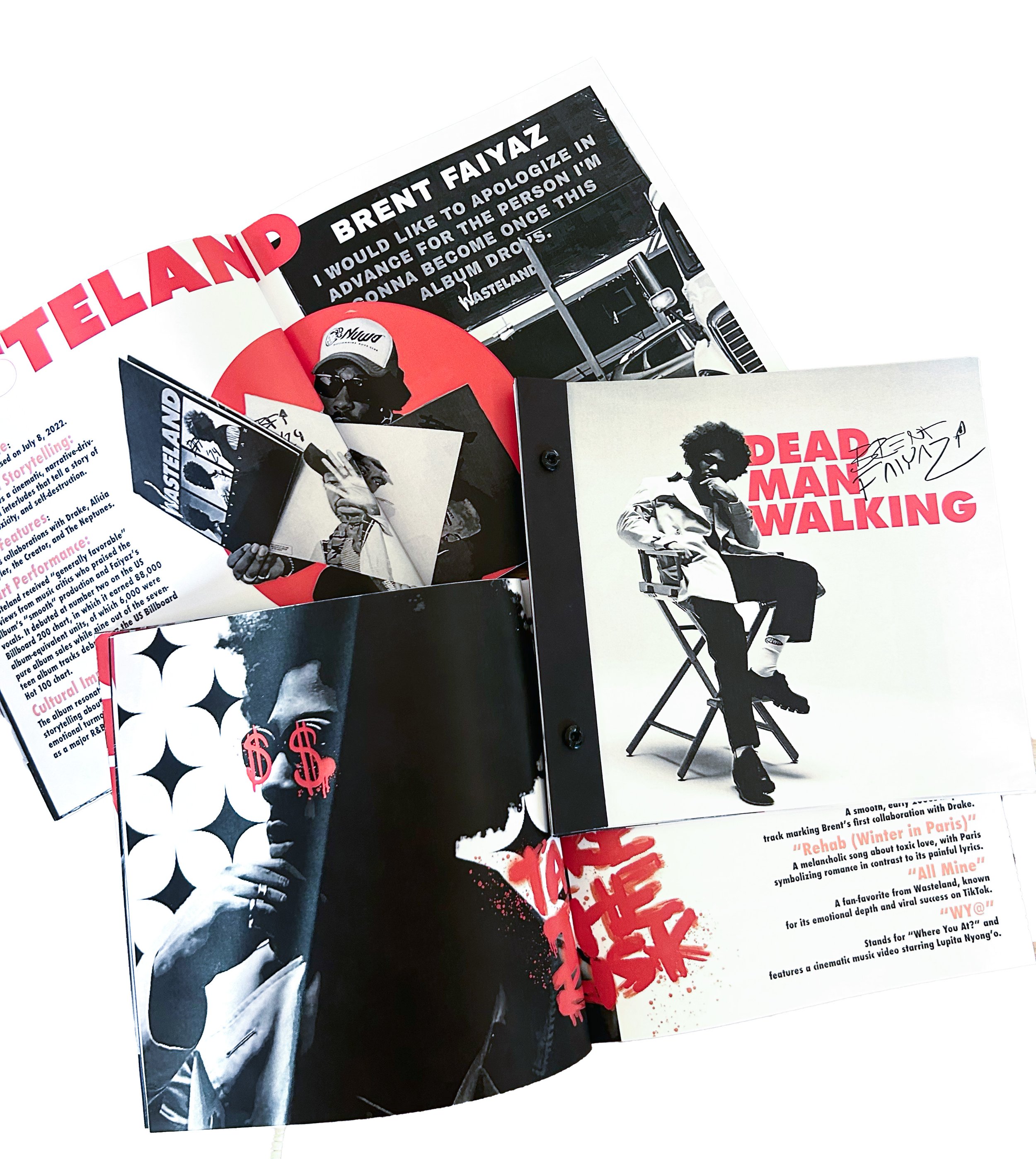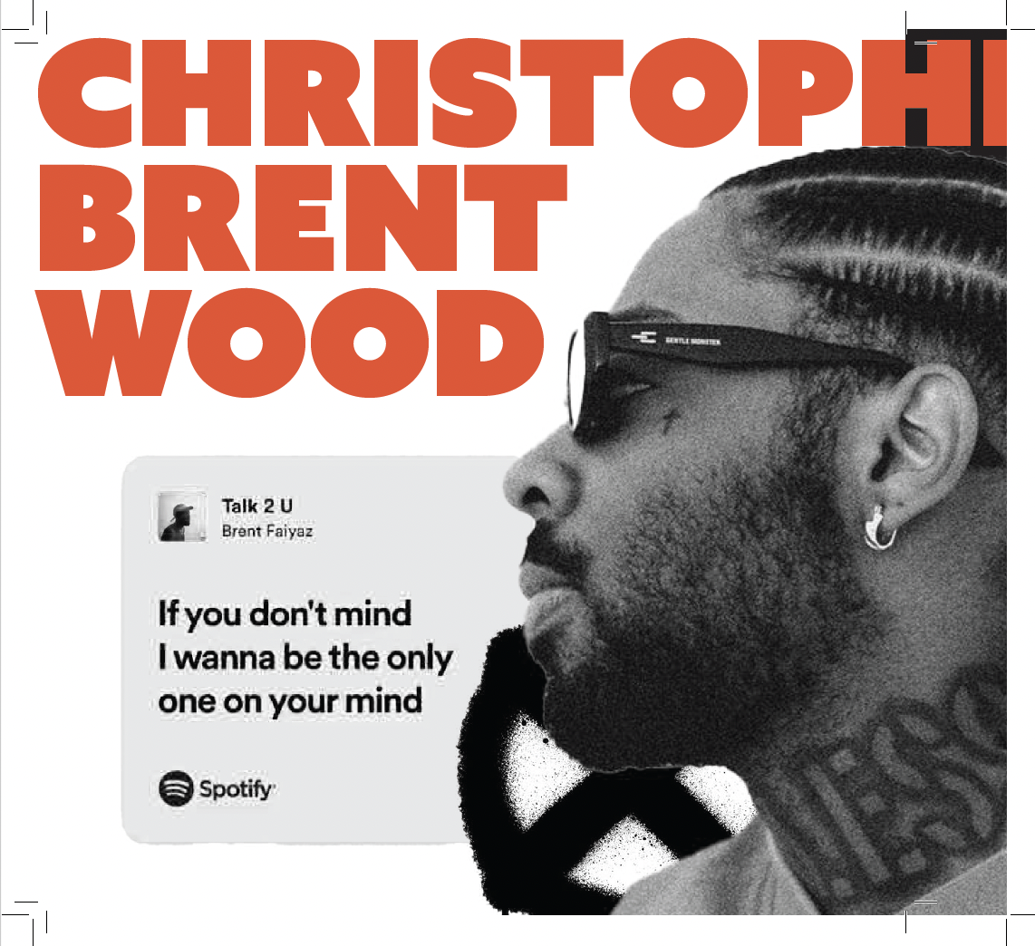 For this project, I designed and produced a two-color zine focused on Brent Faiyaz. The layout features a bold, pop art–inspired aesthetic with high-contrast visuals and dynamic typography, creating an energetic and expressive tone. The publication is filled with curated facts and key highlights about the artist, and it was hand-bound using thick board covers and a screw post binding for a structured, durable finish.