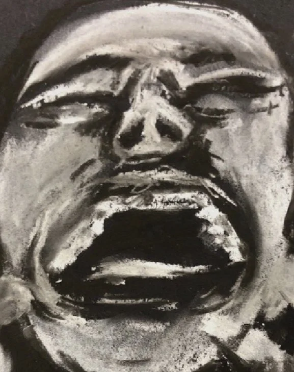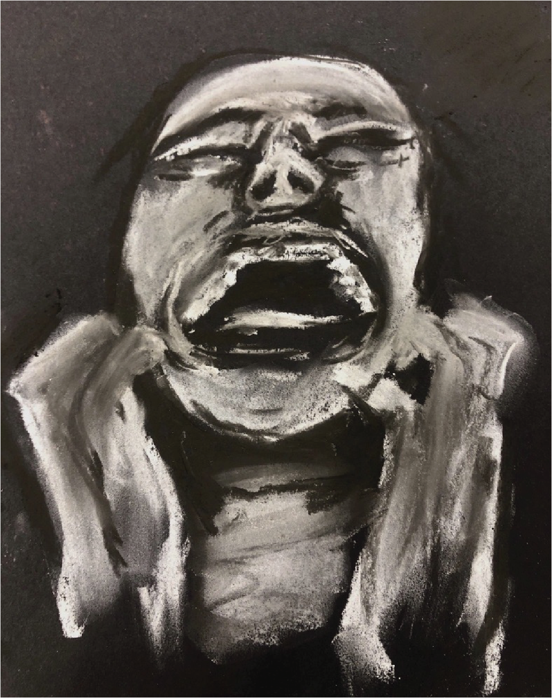 This piece was done at a time that I felt very low and high in emotion. I decided to use my emotion and create this composition of a girl yelling. As a representation of what I was feeling. The materials I used was white charcoal on black paper. This really created a sense of contrast and darkness.