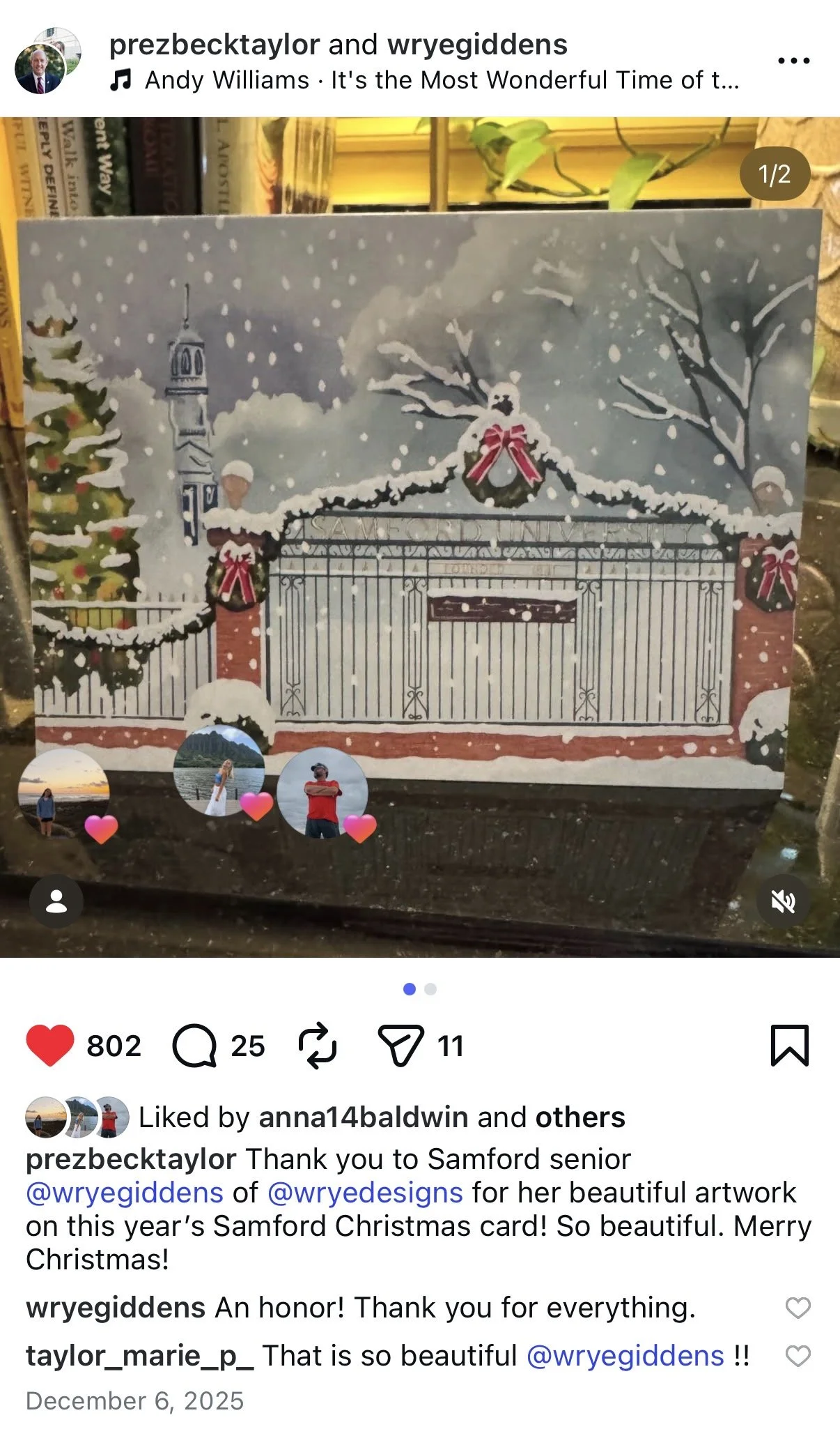 I was selected to illustrate President Beck Taylor’s Christmas card for Samford University, collaborating closely with the Taylors and the university’s marketing team throughout the process. From concept to final artwork, this project combined thoughtful storytelling with detailed illustration to capture the spirit of Samford during the holiday season. It was a true honor and an incredibly meaningful creative experience.