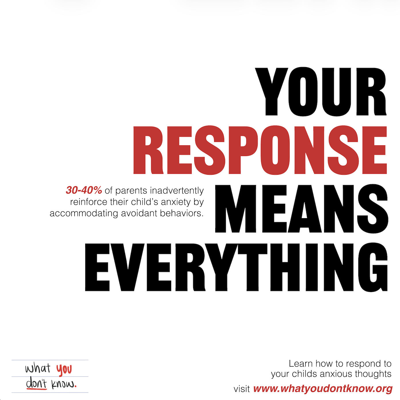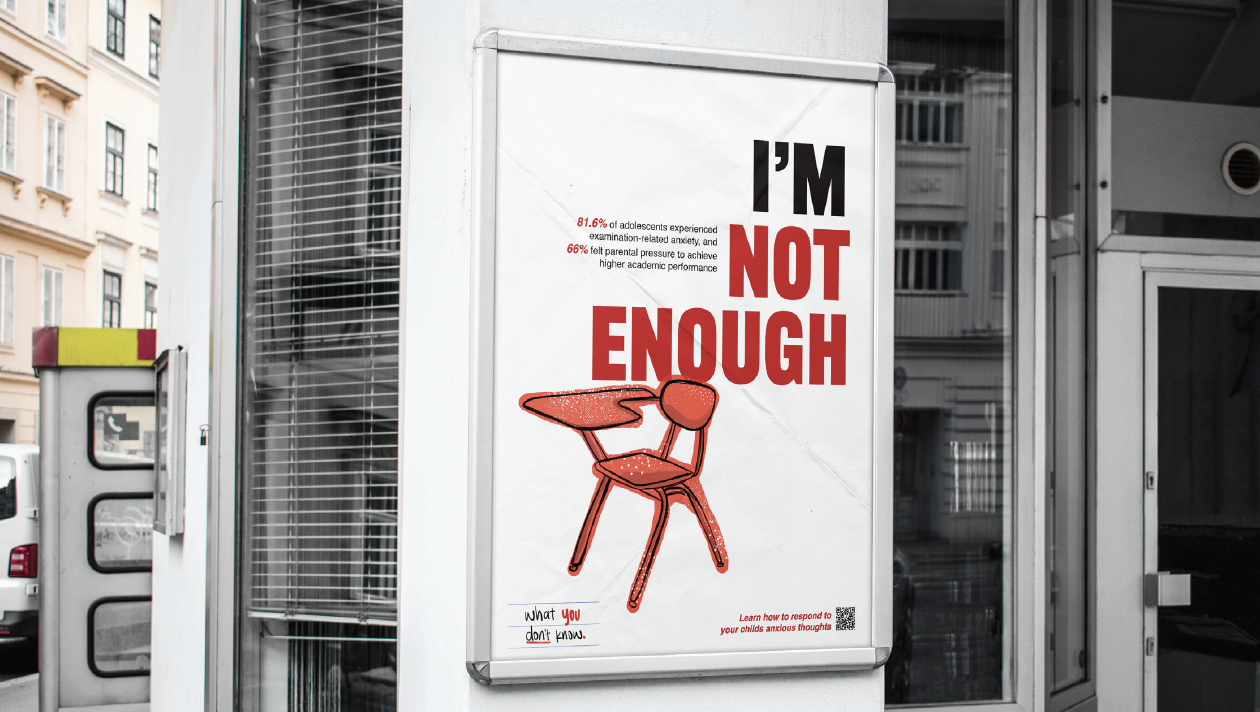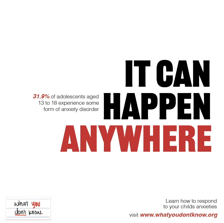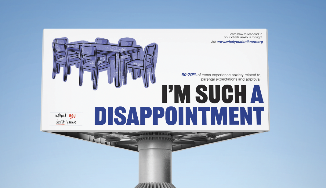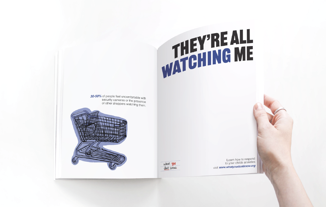 This campaign highlights how childhood anxiety often goes unseen or is unintentionally reinforced by well-meaning parents. Through bold typography and intrusive thought statements, the visuals place viewers inside a child’s anxious mindset while pairing it with research-based statistics. The project encourages parents to recognize anxiety patterns and respond with informed support rather than accommodation.